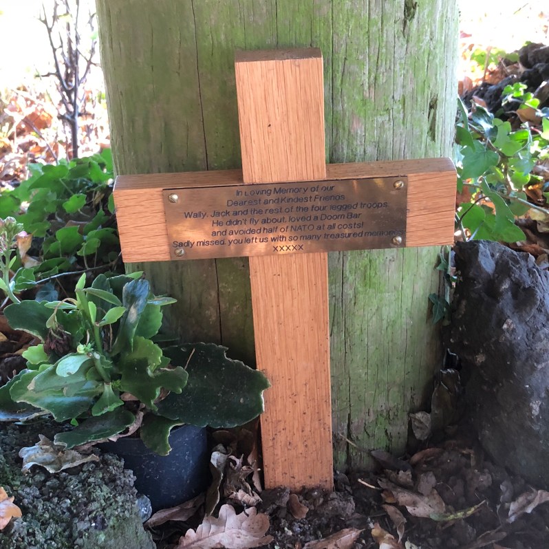 After climbing up a steep field and by-passing a wooded area, we stopped for tea and geo snacks before pressing onwards. In the undergrowth under a few trees we spotted this little cross.