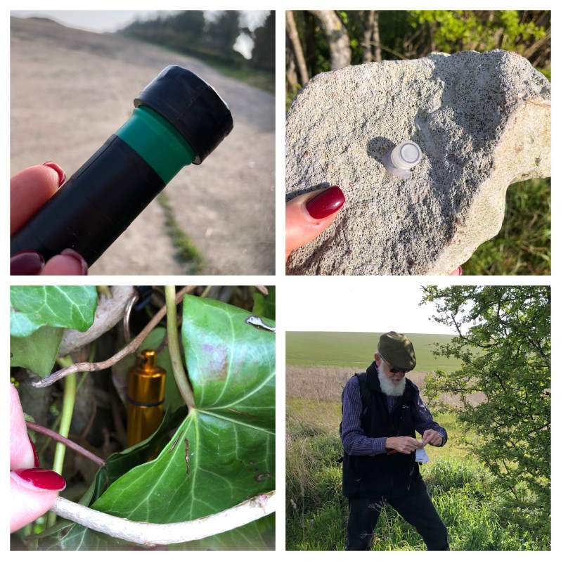 After parking in a nearby road we headed down a wide track to the first location and the cache was soon spotted, logged and replaced. This first cache was near to a display board which mentioned the nearby clunch pit (a small quarry where local people could dig and mine out their own clunch – a chalky material used for building. This was interesting but on the same board was information which interested me even more. Very close by was an area know as ‘Heavens Walls’ an area which had been unearthed in 1821 when some local men had discovered a rectangular space lined with flint rock and Roman walls which enclosed 200 urns and funeral vessels – a skeleton had also been found with a coin between its teeth. Apparently (and not surprisingly) the area was treated with equal awe and dread and local people didn’t go near or by after dark for fear of meeting unearthly or supernatural beings.