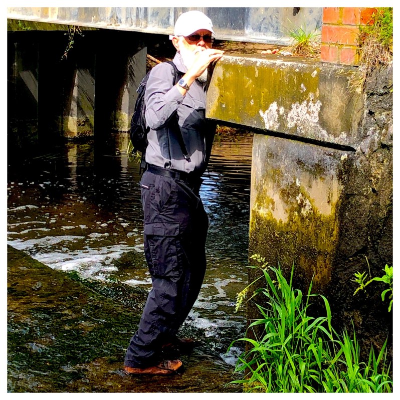 After finding three caches we took a slight detour to a cache by a local ford – which, to be honest, we hadn’t read properly, as when we got to it, it said that we’d need Wellington boots to access it. The Man however was unperturbed and bravely headed into the water to grab it.