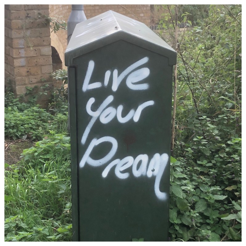 After parking right next to the first cache – which was quickly found, we headed off (past this rather inspirational graffiti 😂) along a small stream to the next cache.