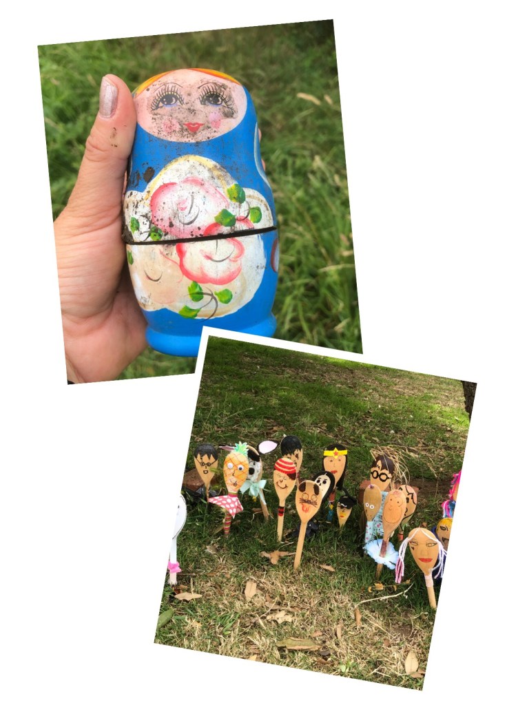 Our next stop involved looking for one cache we’d previously looked for and hadn’t found. When checking the logs, the last cacher had found it recently – so, after much searching, we did find it but at the bottom of a ditch surrounded and covered with brambles. Luckily ‘The Man’ managed to get the other side of the ditch and he fished it out. It was worth it to find a beautiful babushka doll (slightly muddy) but beautiful. After this we did a few drive-by caches where we found this odd ‘Laddletown’ installation made by the local guide group. Bizarre.